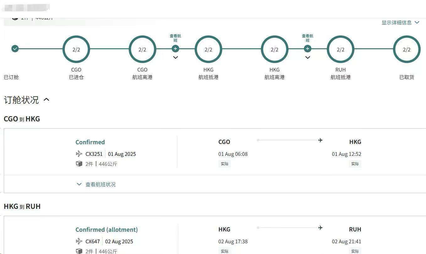 - 固定航班保障:郑州-香港段配备CX051、CX3251等多班固定航班,香港-利雅得段固定执行CX647等班次,舱位长期锁定确认,彻底规避旺季舱位紧张、临时甩货的行业常见痛点,为货物运输提供刚性保障;