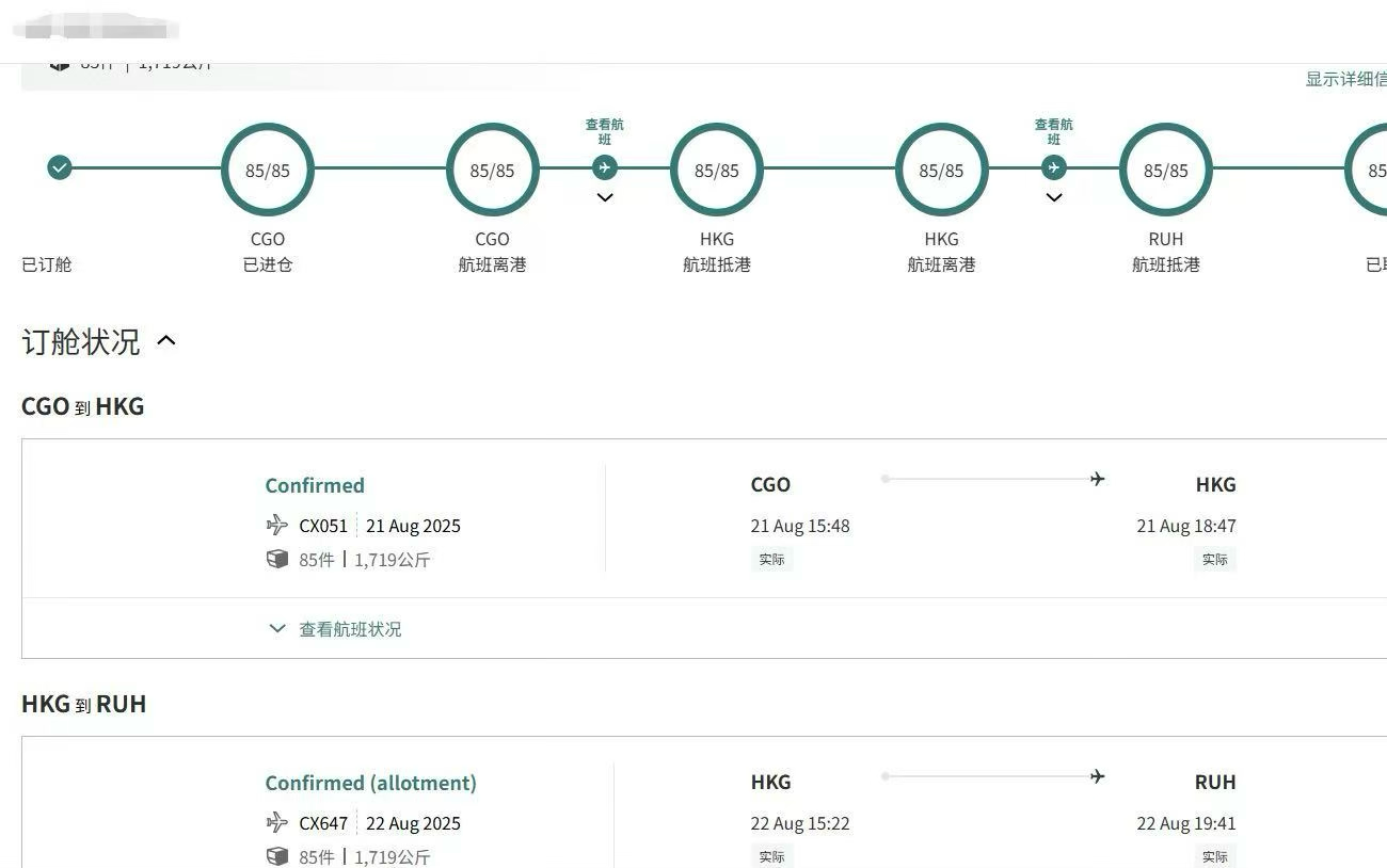 - 固定航班保障:郑州-香港段配备CX051、CX3251等多班固定航班,香港-利雅得段固定执行CX647等班次,舱位长期锁定确认,彻底规避旺季舱位紧张、临时甩货的行业常见痛点,为货物运输提供刚性保障;